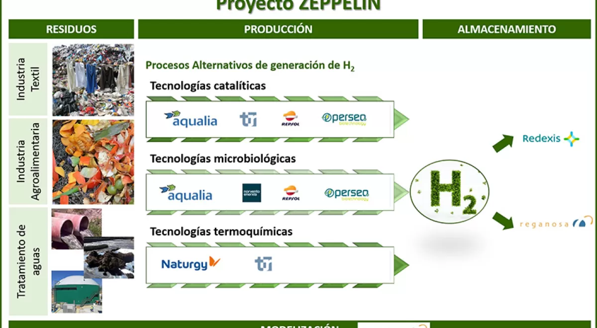 AQUALIA, líder de la propuesta, es uno de los actores más importantes a nivel mundial del sector del agua. En ZEPPELIN, desarrollará procesos de reformado en seco del excedente de biogás y la fermentación oscura y la electrolisis microbiana a partir de lodos de EDAR y aguas residuales. NATURGY, siendo líderes en el sector del gas y un referente en el sector eléctrico, investigará en la obtención de syngas (gas de síntesis o sintegás, en español) mediante tecnologías de gasificación y en la separación de hidrógeno para alcanzar hidrógeno apto para su uso. NORVENTO, como experta en energías renovables, investigará tecnologías de fermentación oscura y procesos de purificación del hidrógeno. PERSEO, gracias a su experiencia en desarrollo y diseño de procesos para la valorización de residuos en productos de valor añadido, será la compañía encargada de investigar tecnologías de reformado húmedo del bioetanol producido. REDEXIS, siendo una compañía con gran expertise en el desarrollo de redes de transporte y distribución de gas natural, será la encargada de investigar procesos de almacenamiento de hidrógeno verde en forma de amoniaco. REGANOSA, empresa dedicada al transporte y regasificación de gas natural, investigará procesos de almacenamiento en materiales porosos y diseñará una herramienta de modelizado de producción de hidrógeno verde. TÉCNICAS REUNIDAS, la mayor ingeniería de España, especializada en desarrollo de tecnologías avanzadas para procesos industriales, investigará también la producción de syngas mediante reformado seco de biogás y reformado húmedo de bioetanol, la optimización de producción de hidrógeno en gasificación y la purificación y captura de CO2. REPSOL, siendo una multinacional energética y petroquímica española, investigará la producción de biohidrógeno mediante tecnologías de fermentación oscura y la producción de syngas mediante técnicas de reformado húmedo de bioetanol.