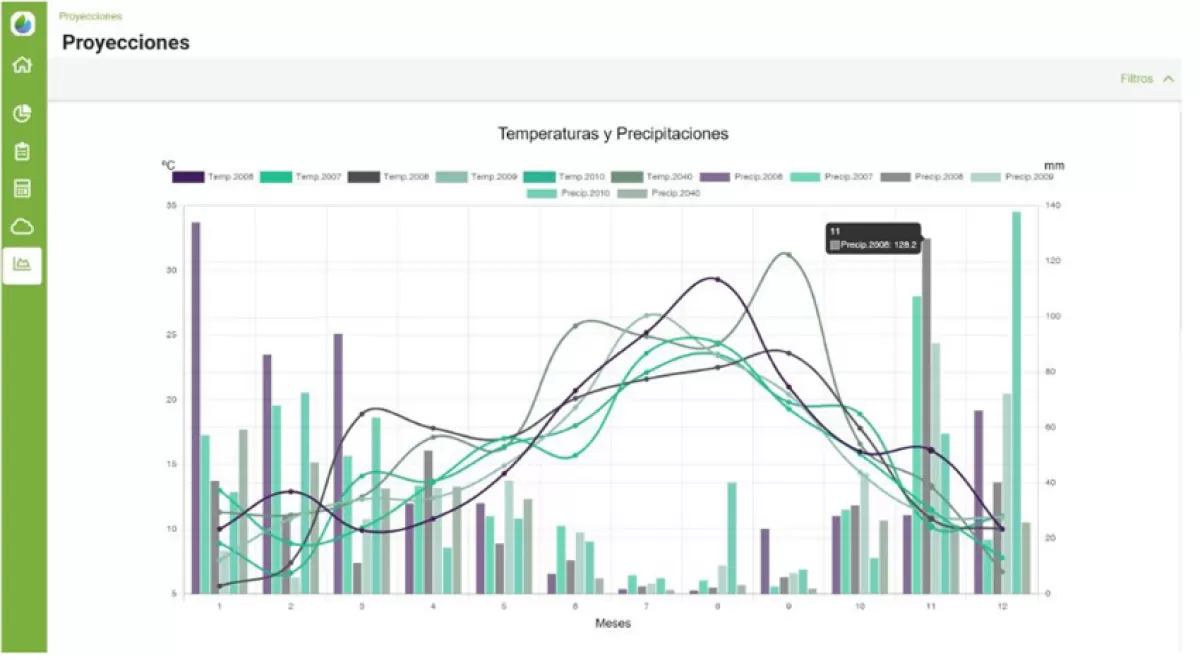 Por un lado, la plataforma AGROgestor ofrece servicios de gestión colectiva de los cultivos a través de indicadores de productividad, eficiencia y sostenibilidad. También cuenta con una herramienta de caracterización de escenarios climáticos que permite realizar simulaciones para las variables temperatura, precipitación y evapotranspiración de referencia, de manera que estos datos puedan ser empleados por las herramientas de balances con la finalidad de evaluar los impactos y la vulnerabilidad de los cultivos.