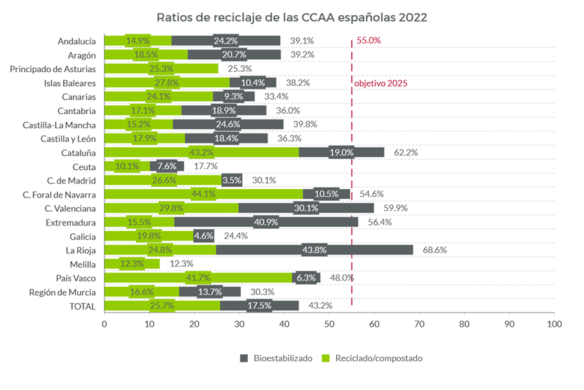 En 2020, España se quedó a 8,6 puntos de cumplir con el 50%, en 2022 estábamos a 11,8 puntos del objetivo de 2025. Alcanzar el objetivo del 60% en 2030 queda muy lejano y más considerando una previsible caída de más de 15 puntos desde 2027, cuando dejen de computarse los bioestabilizados.