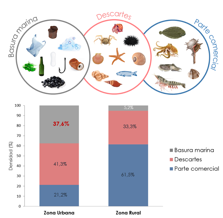 Nuestro trabajo revela que, en zonas cercanas a áreas muy pobladas con rutas de navegación transitadas, la basura puede suponer hasta el 38 % de la captura en la red de pesca. Se encontraron densidades de basura que oscilan de los 198 a los 393 kg por km².