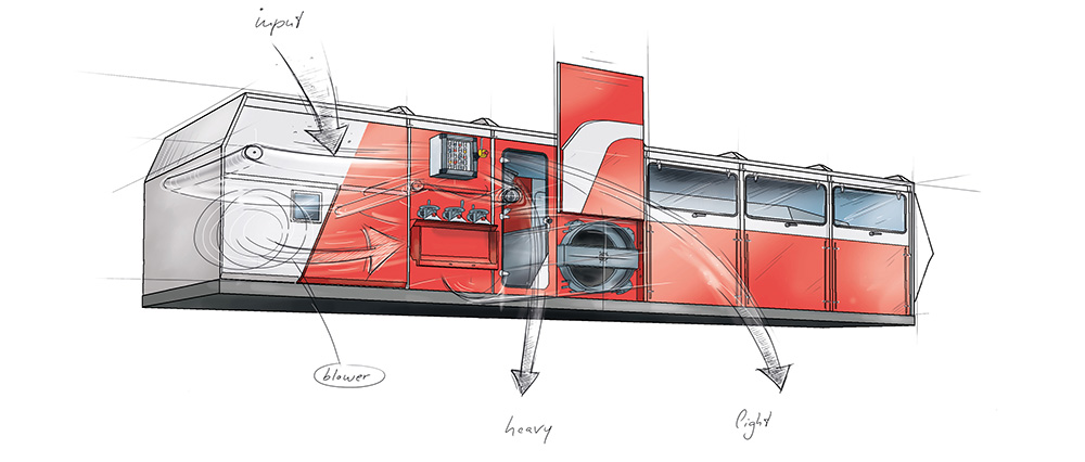 AirLift, equipo densimétrico para la separación de ultraligeros de los ligeros. Los ultraligeros son separados por aspiración desde un transportador de banda en forma de banana, descargando los ultraligeros y separándolos del aire con el AirWheel. Puede suministrarse como equipo único o como complemento e integrado en el AirStar y AirBasic.