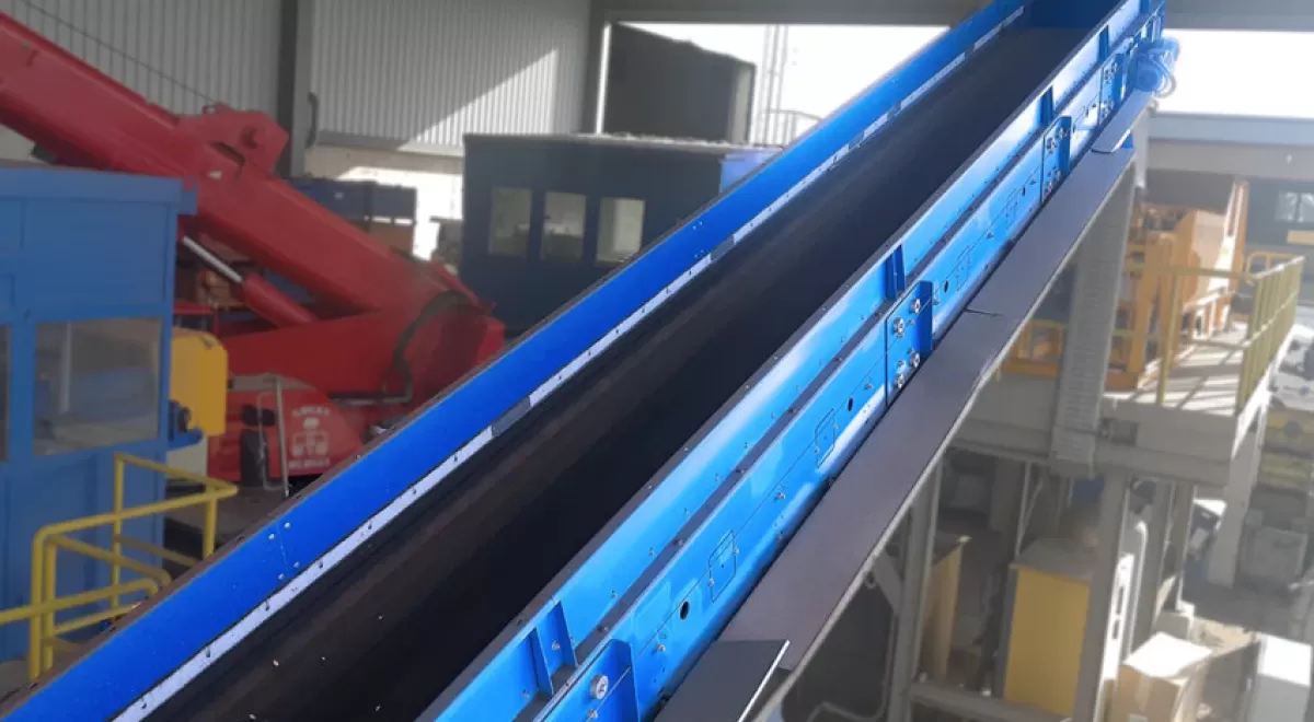 Sidewall conveyor belt: La cinta transportadora está compuesta básicamente por una estructura metálica electro soldada que confiere rigidez al conjunto y unas placas transportadoras en forma de U que unen en sus extremos con las dos cadenas que discurren una a cada lado en todo lo largo, produciéndose el movimiento de dicha cadena por medio de dos engranajes superiores que van enganchados a un eje que gira entre rodamientos y al que se le transmite el movimiento desde el exterior por un extremo del citado eje.