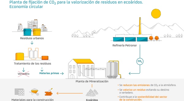 Para la puesta en marcha de esta planta se utilizará de CO2 capturado, como el que proviene de la refinería de Petronor, y mediante la tecnología de O.C.O. se hace reaccionar químicamente el CO2 con residuos procedentes de la incineración de RSU